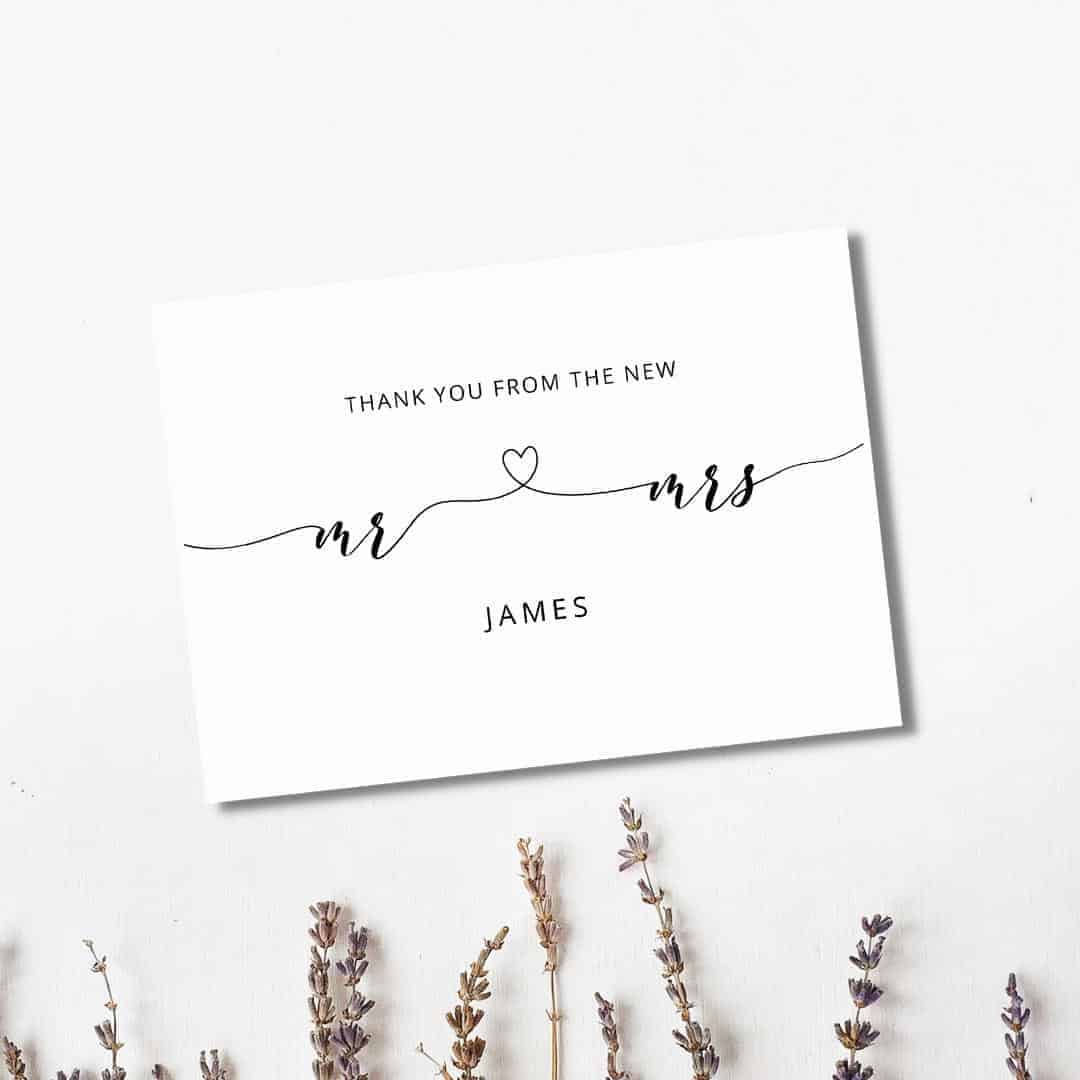 Featuring a bi-fold card with the inscription “Thank You from the new Mr. ♥ Mrs.” printed in black characters on a white background, this card is fully customizable. You can easily add your text on the interior pages. Change the design to one of the pre-existing templates or simply upload yours.