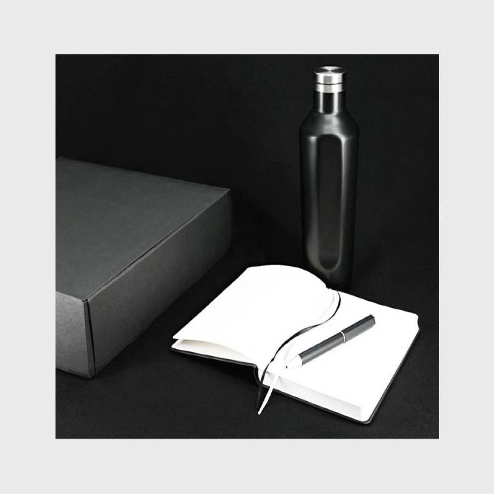 Gift set consisting of a double walled water bottle, pen and notebook. The water bottle keeps liquids cold for up to 12 hours and hot for 8 hours without any sweating on the exterior. Notebook is a retro piece of art that gels perfectly with the hexagonal body pen having German Dokumental® ink. A perfect gift that communicates modern flair.