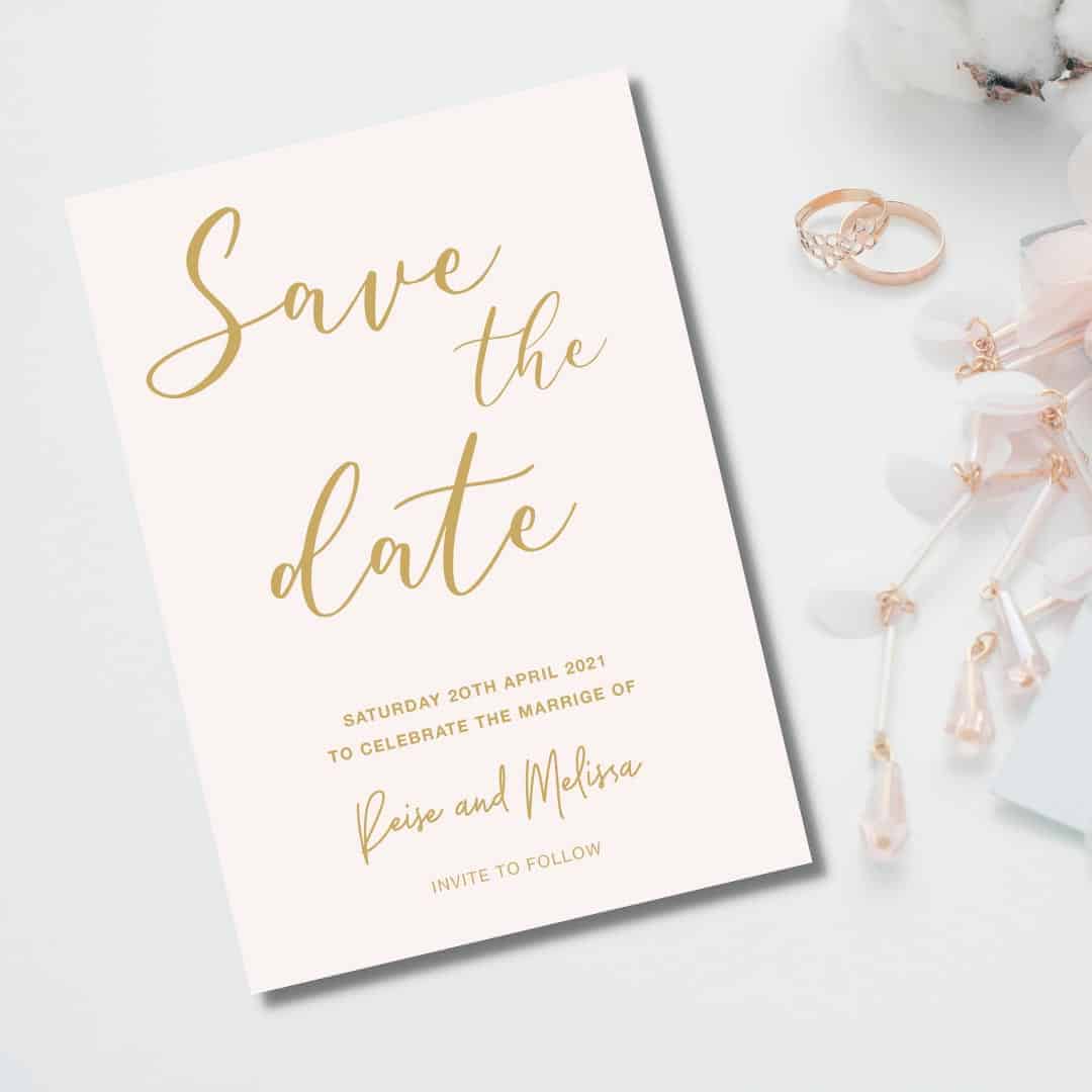 It’s time to celebrate! Spread the news to your friends and let them know you’re ready to walk down the aisle using our “Golden Save the Date Cards”.