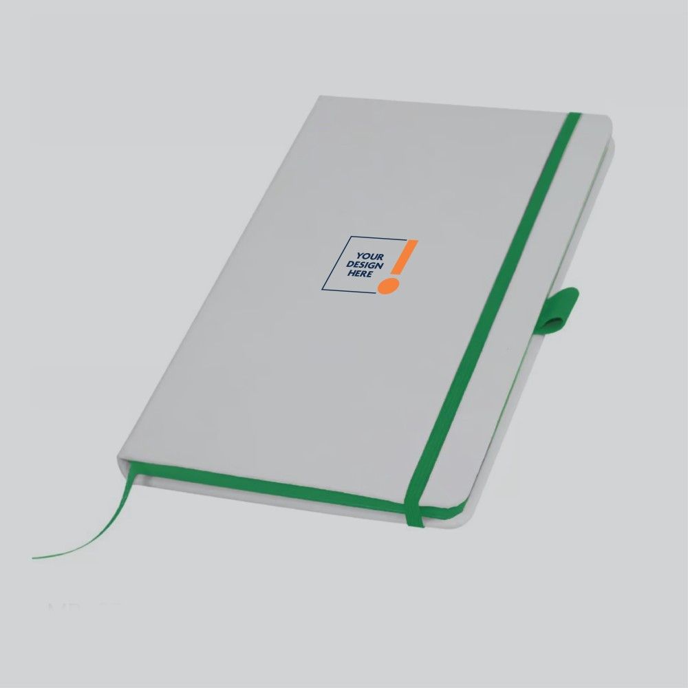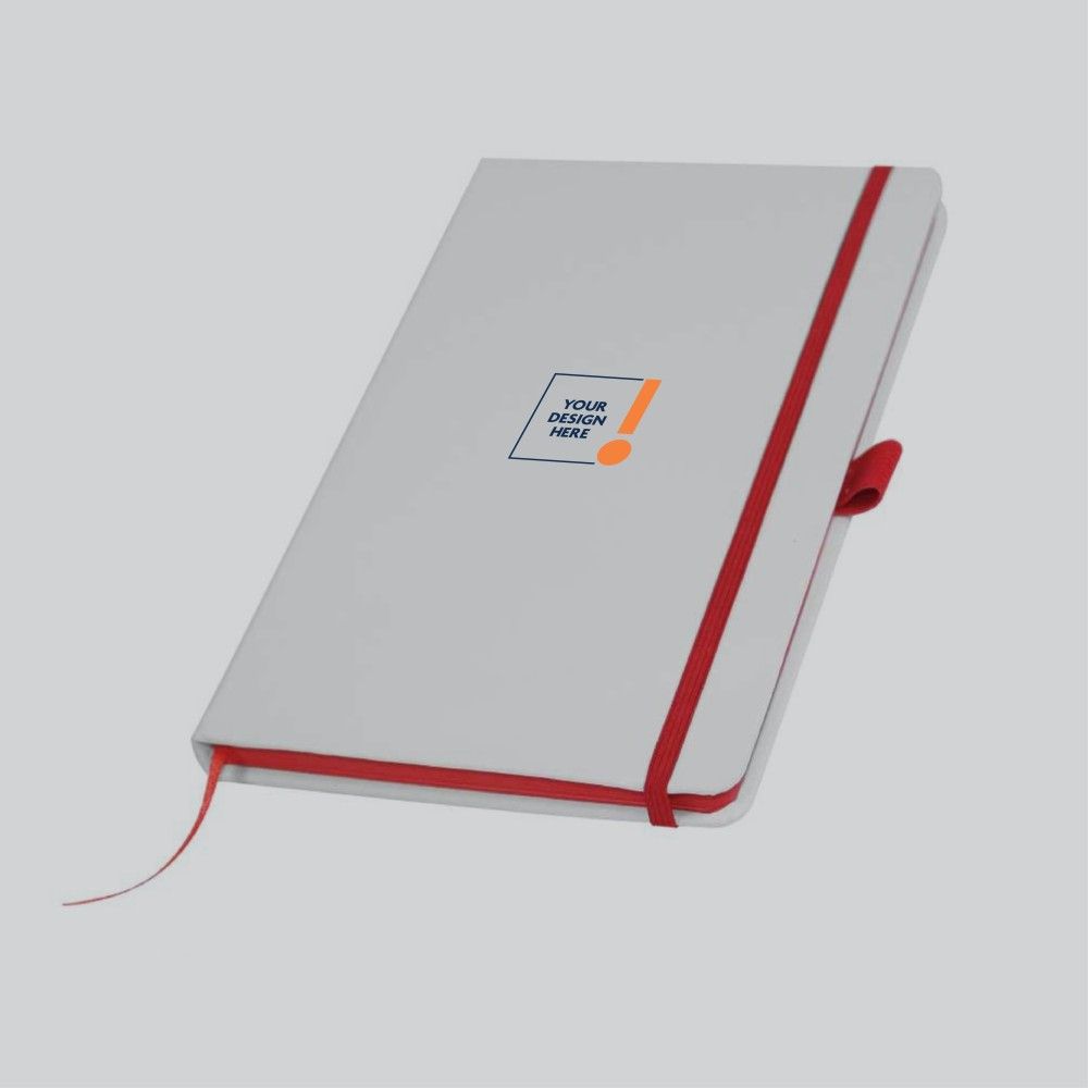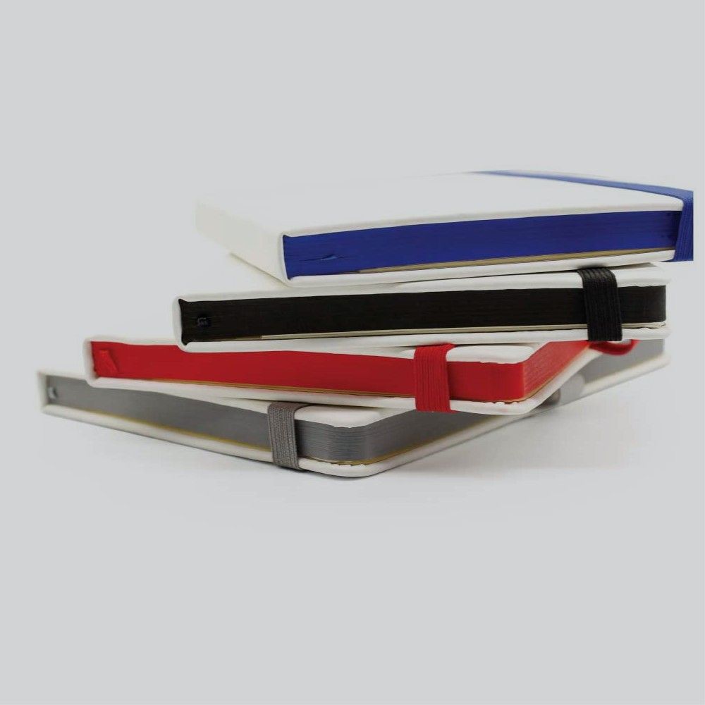 Elegant A5 notebooks with a white PU leather cover, offering both style and functionality. The durable PU leather cover features a sophisticated pattern, ensuring reliability and a premium feel. Each notebook comes equipped with an elastic band, ribbon bookmark, and pen holder, and is available in a variety of vibrant colors.
