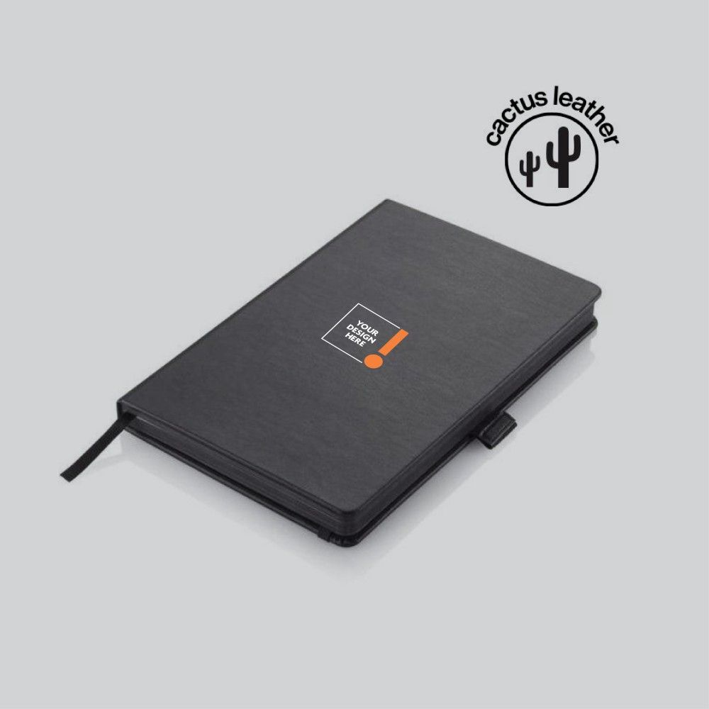Cactus Leather Notebook, featuring a cover made from 45% cactus material by weight, sourced from the leaves of the cactus plant. This highly sustainable material uses minimal water resources and provides an animal-free, cruelty-free alternative that lasts up to 10 years. Inside, the notebook boasts 192 black-edged pages of FSC-certified 100 gsm paper.