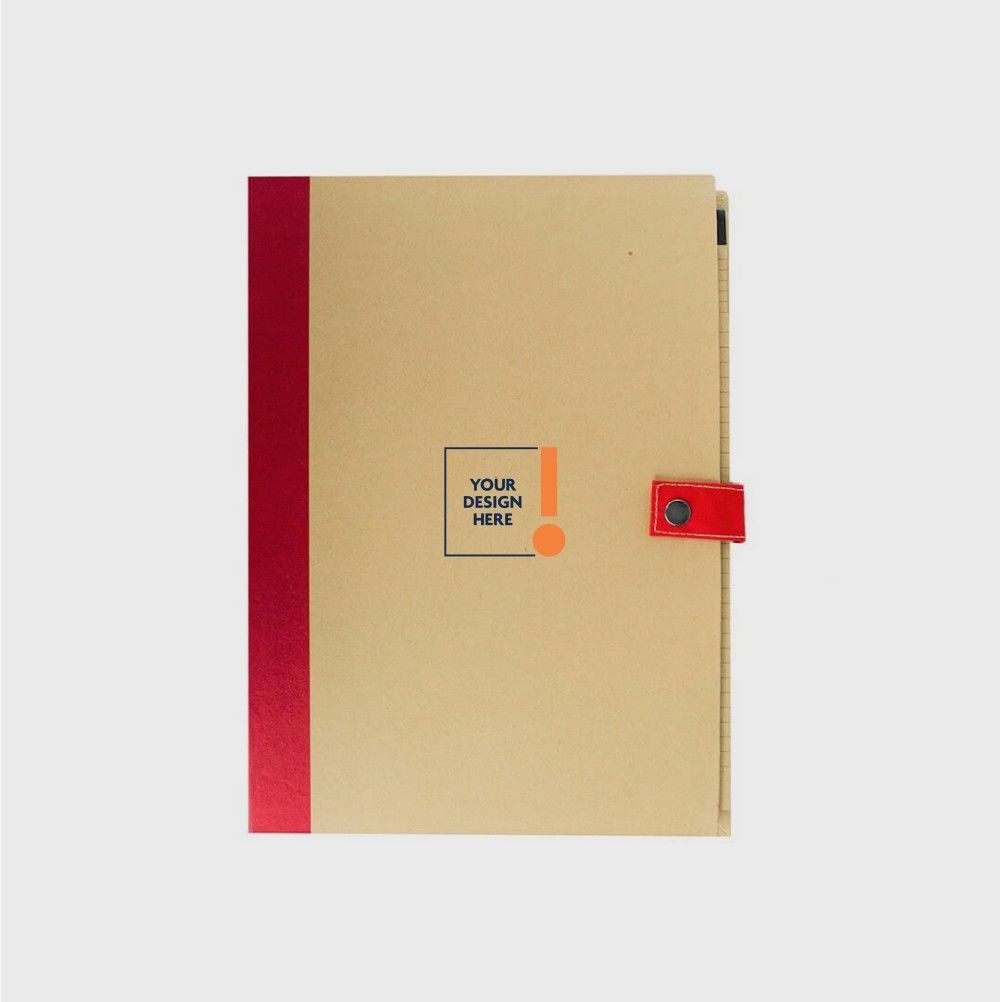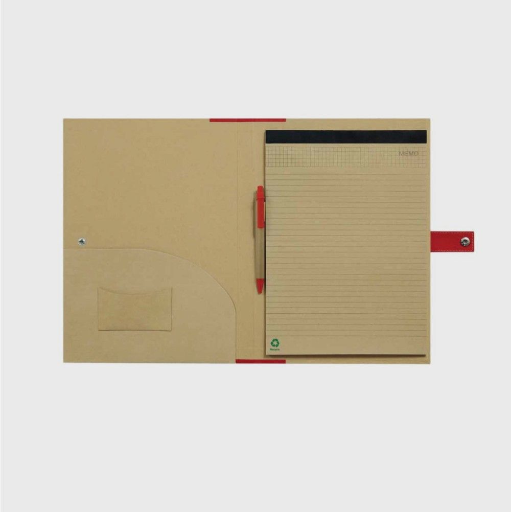 A4 folder with a button closure made from Eco-friendly material. Consists of a notepad with 70 pages, matching coloured pen, and a pocket to keep documents and business cards.
