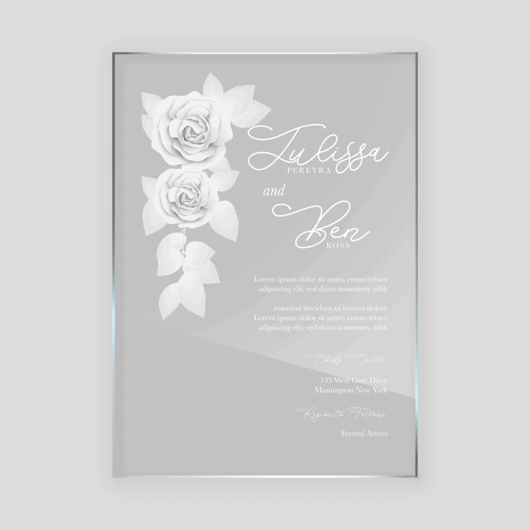 Acrylic Wedding Invitation Cards are a special kind of wedding invitation cards made of acrylic plastic material. These invites are beautifully designed with unique classy floral prints with script printed in white ink. Acrylic cards are a perfect choice for a modern wedding to create a beautiful memory in minds of your guest.