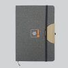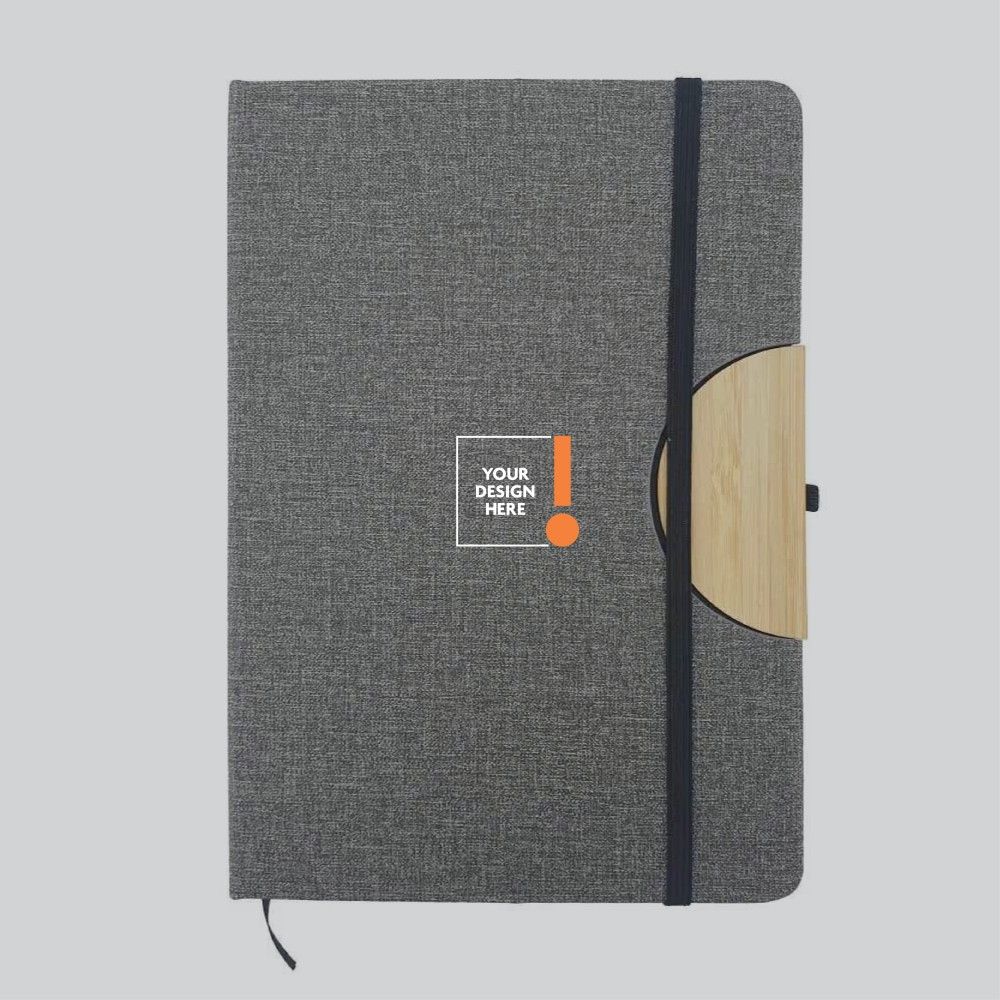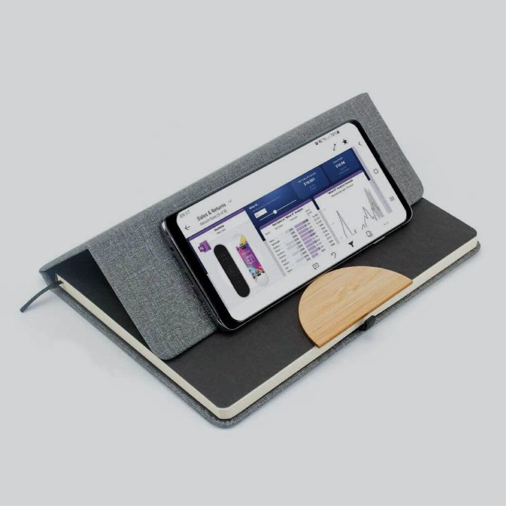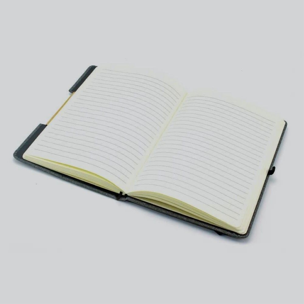 The Dorniel Designs A5 notebook offers a stunning and opulent design, perfect for sophisticated branding. Featuring a foldable gray fabric cover with a touch of bamboo material, it combines elegance with eco-consciousness. The front cover includes a practical mobile phone holder and stand, adding functionality to its sleek design. Inside, the notebook contains 80 sheets of cream-colored, 70 GSM ruled paper, complemented by a black elastic ring with a pen loop. Ideal for those who appreciate both simplicity and style, this notebook is a standout choice for effective advertising and branding.