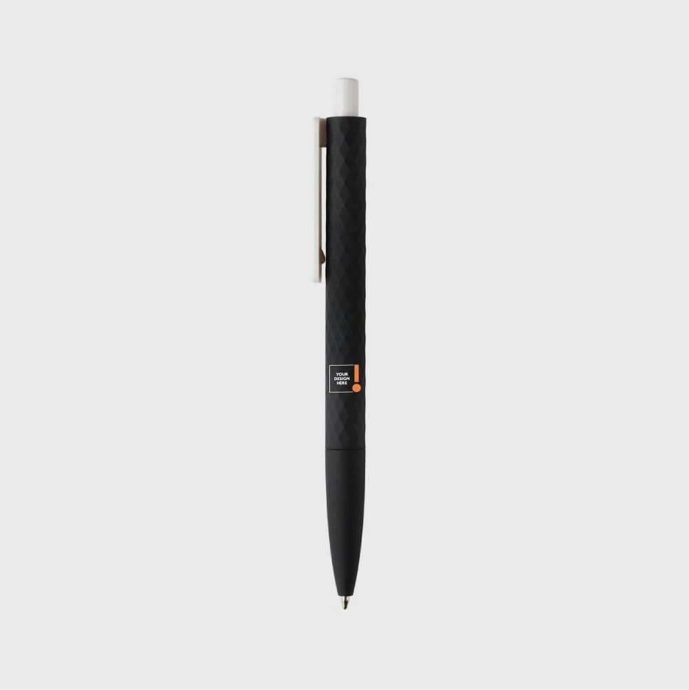 Soft touch (rubberized finish) plastic pen with geometric design. Blue ink.