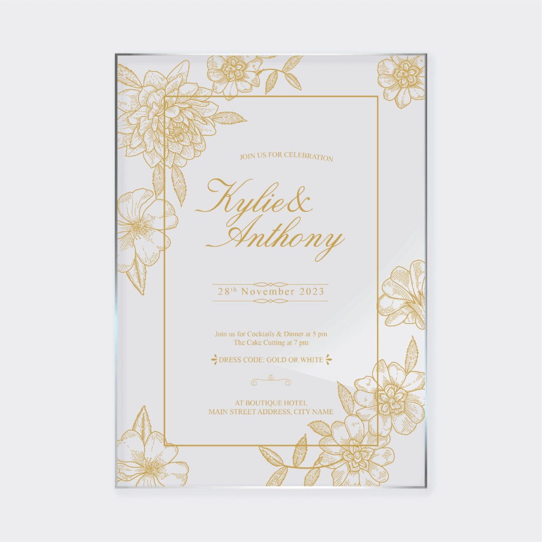 The Invites are made from acrylic plastic which are sturdy in nature with 2mm Thickness. Available in two options clear transparent acrylic material and frosted acrylic material. . The edges are square shaped. The acrylic invites are printed on an acrylic stock with the help of a specialized digital printing machine that provides perfect colour effect on the Invite.