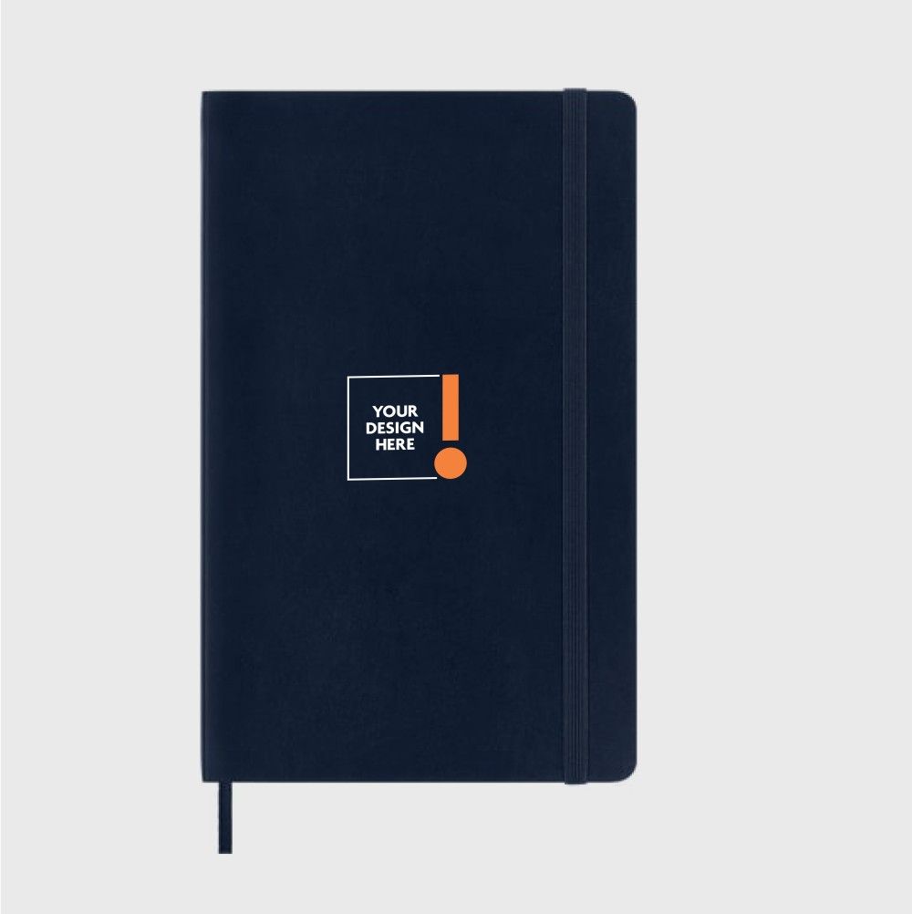 Moleskine® Large soft cover notebook, ruled, rounded corners, elastic closure.