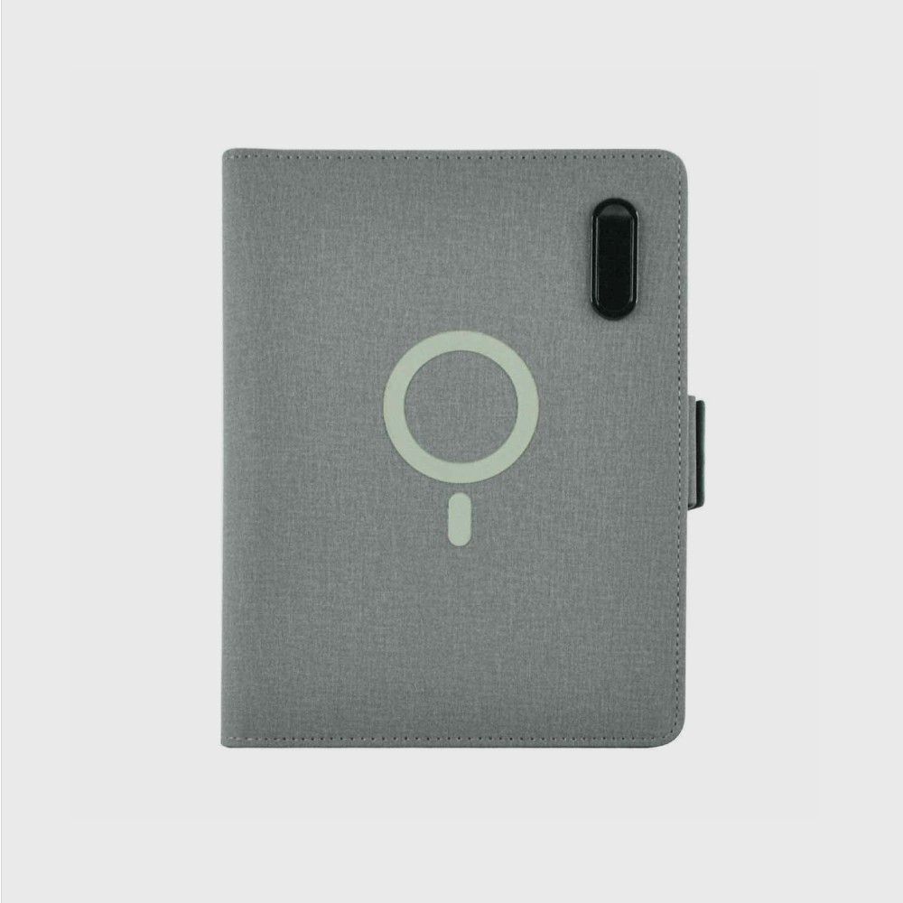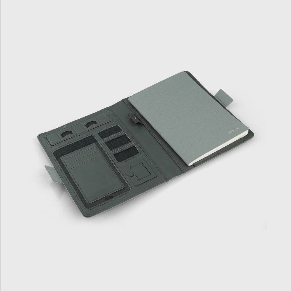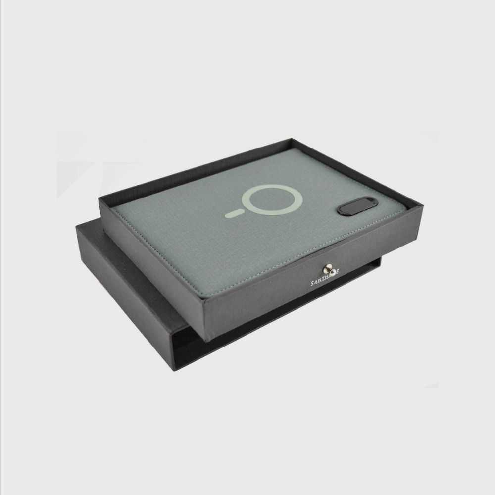 MagSafe Smart Notebook Portfolio combines design elegance and latest magnetic charging technology. With an impressive 8000 mAh powerbank, 10W MagSafe magnetic wireless charging, 32GB USB in-built flash drive, numerous ports, card pockets, phone/tablet pocket, pen loop, phone vertical/horizontal stand and an elegant refillable A5 notebook with ivory paper. Snap your phone (iPhone 12 or higher) to the wireless charger and the phone will align perfectly with the magnets inside. The 10W wireless charger is compatible with all QI devices (Iphone 8 and up and Android devices). Packed in an elegant sliding gift box.