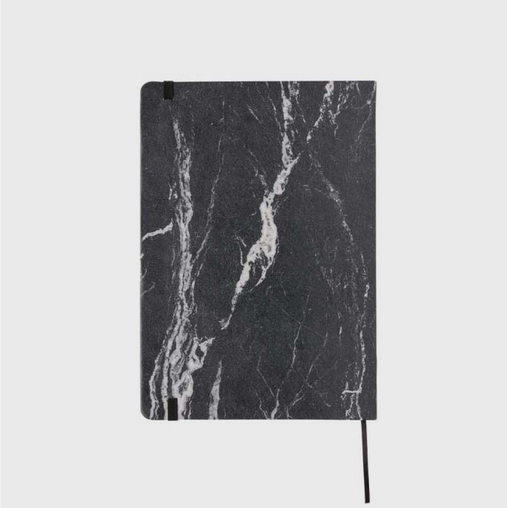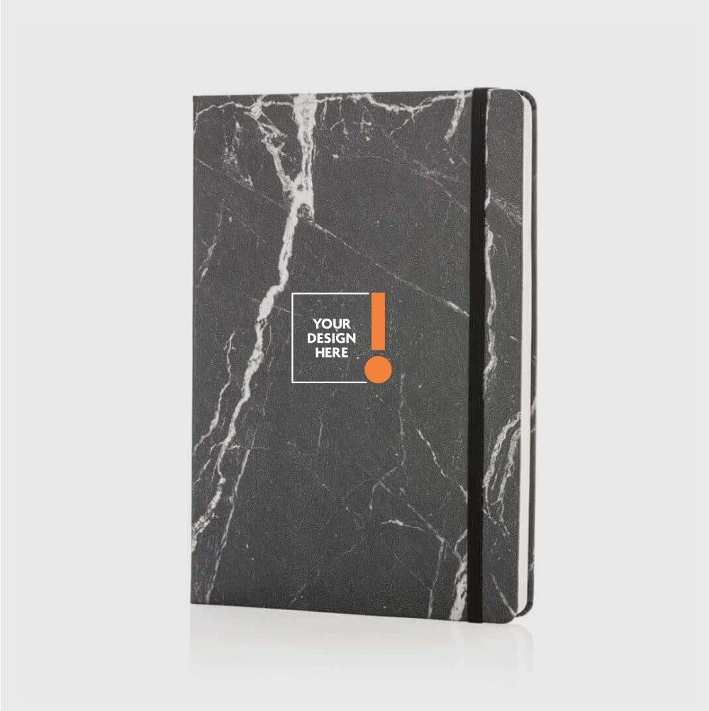 Ruled A5 hardcover PU deluxe notebook in marble style with an elastic closure and bookmark ribbon.192 pages (96 sheets) of 80g/m2 inside. Cream coloured pages.
