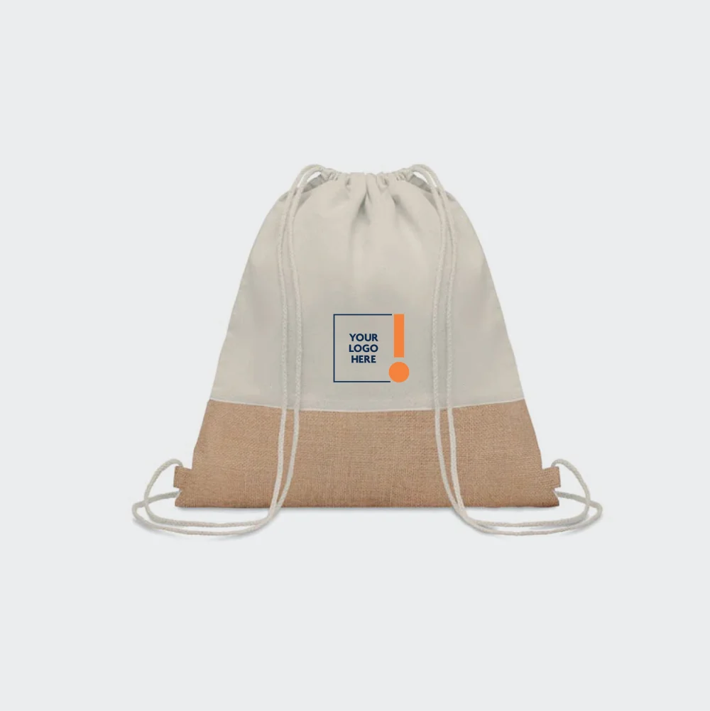 Crafted from 140GSM recycled cotton and jute combination, this eco-friendly bag features a white drawstring rope for secure closure. A sustainable and stylish choice for carrying essentials.