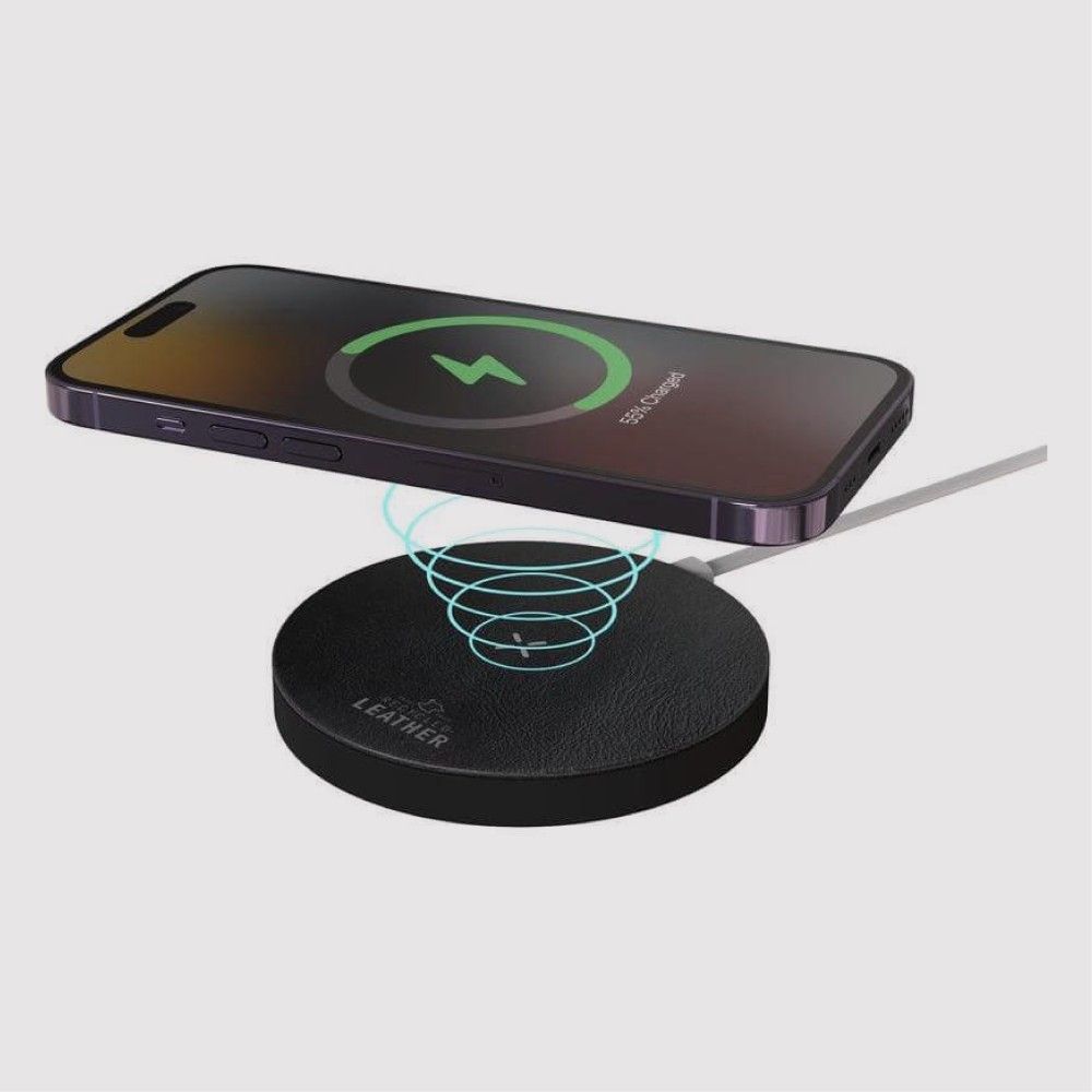 Our environmentally conscious 15W Wireless Charger, crafted from RCS-certified recycled genuine leather and post-consumer recycled ABS. Designed with sustainability and versatility in mind, this wireless charger offers a seamless charging experience for a wide range of devices while reducing environmental impact. Compatible with all wireless devices, including the latest Android generations and iPhone 8 and above, our charger ensures hassle-free charging for your smartphone, tablet, and other Qi-compatible gadgets. With 15W of power, it delivers fast and efficient charging to keep you powered up throughout the day. Equipped with four anti-slip pads, our charger provides stability and security for your device while it charges, ensuring it stays in place on any surface. Plus, its sleek and stylish design adds a touch of sophistication to any space, whether it’s your home, office, or on the go. Each charger is meticulously crafted from recycled materials and packaged in a recycled kraft paper gift box, making it a thoughtful and sustainable choice for both personal use and gifting.