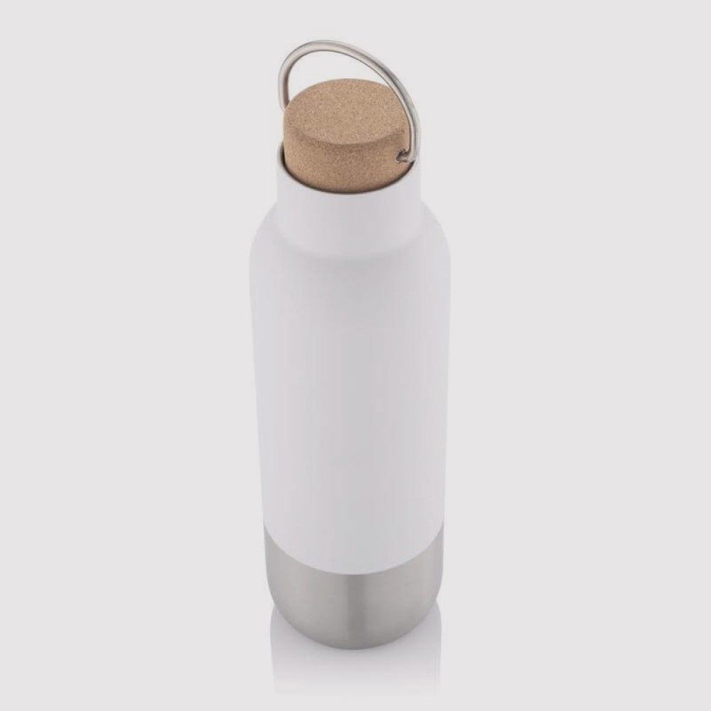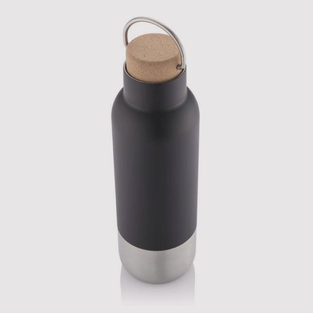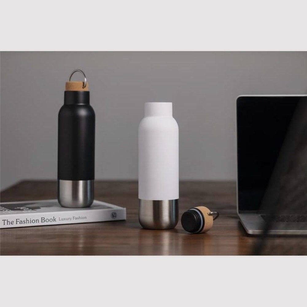 Aversa is 22oz Premium Double-Walled Vacuum-Insulated water bottle made from 83% RCS- certified recycled stainless steel, 2% cork, and 15% iron alloy/PP materials. Features a leak-proof cork lid with a carry handle, SS-304 grade stainless steel for corrosion resistance, and a 650ml capacity. Sustainable and stylish, it comes packed in a gift box.