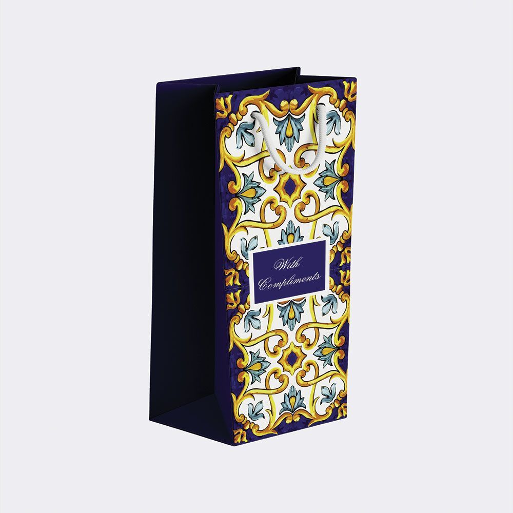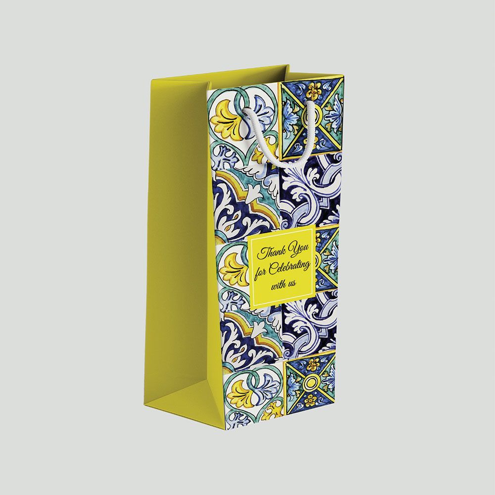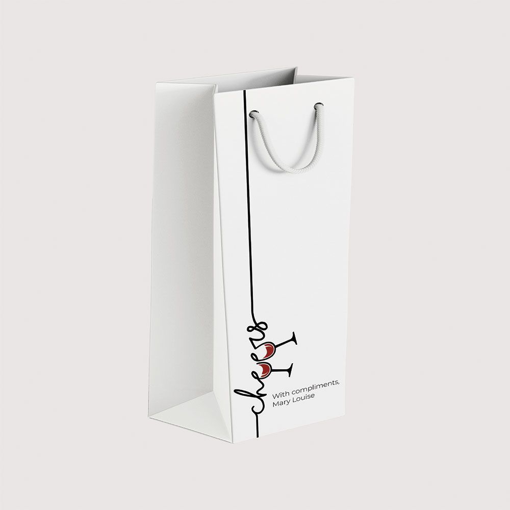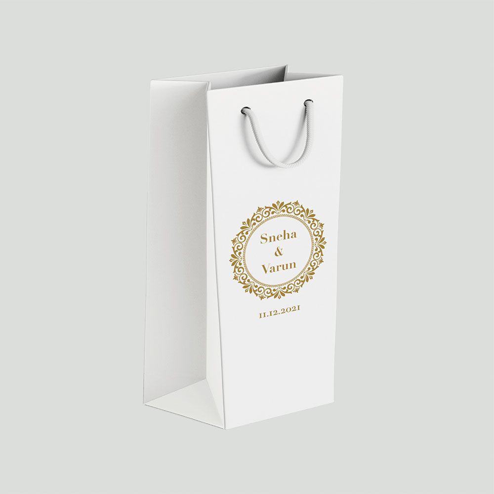 Designed and sturdily built with a twisted set of ropes strong enough to carry any bottle, this bottle bag comes ready in a well-folded high-quality card paper, with thickness options of 300 GSM It comes in 4 color variations and a matt and glossy paper option. Having a customizable tag option to edit based on your occasions.