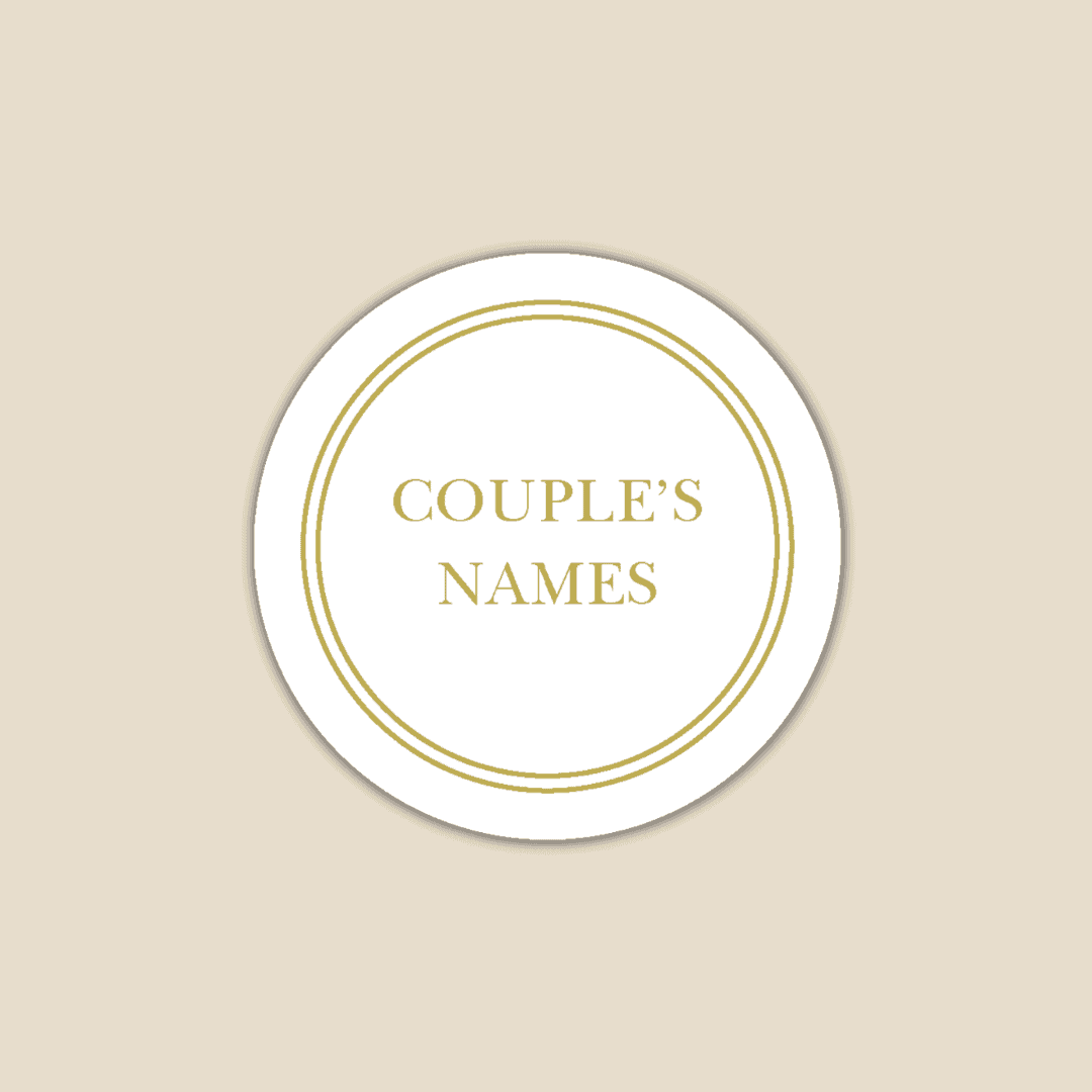 Featuring a simple design, our wedding sticker has a circular design with two golden circular borders hosting the couple’s name which is printed in gold.